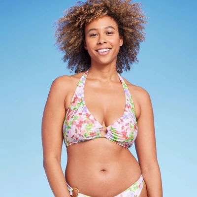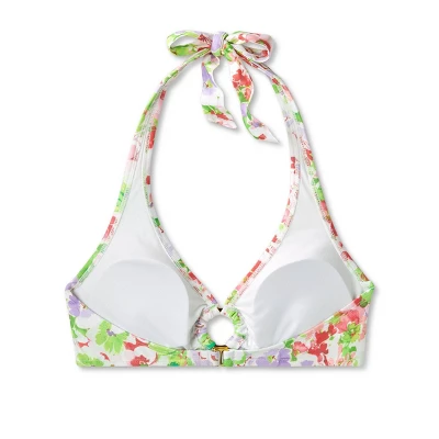 This Multi Floral Print Halter Center Front Ring Bralette Bikini Top from Shade & Shore™ brings colorful, botanical charm to your beachwear. It’s detailed with a gold-tone metal ring accent at the center for a chic touch of shine. Made from soft and stretchy opaque fabric, it offers flexible comfort whether you’re swimming or lounging on the shore. The back with a hook and adjustable tie closure helps you find a custom fit, and the removable cups offer customizable coverage.